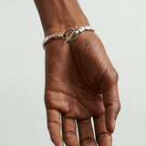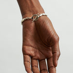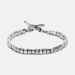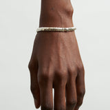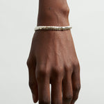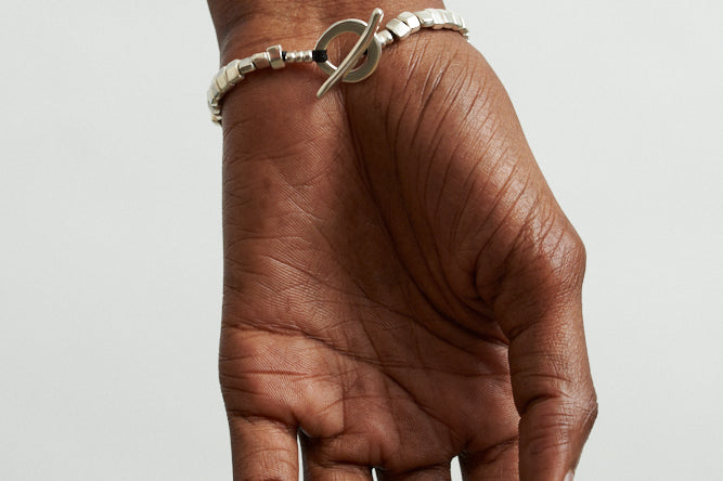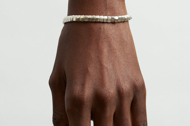 The Lucky Rocks Bracelet reflects light playfully through movable 1/4" x 1/8" sterling silver pieces, held snugly together by a hand crocheted cord.
