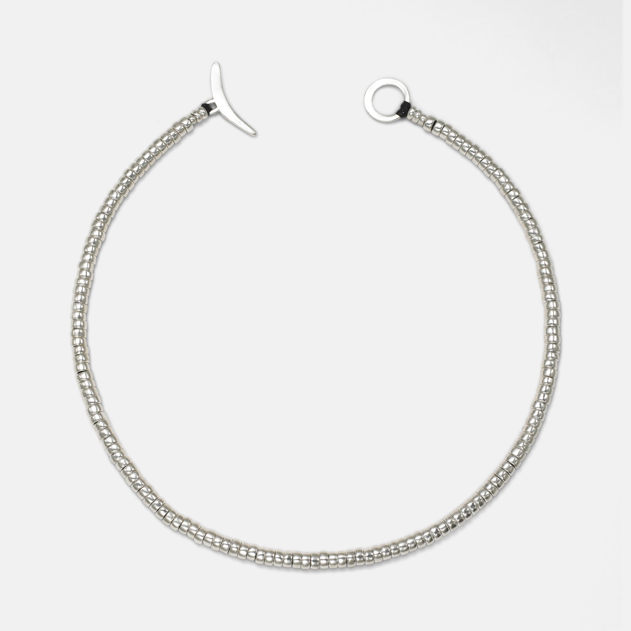 Our Baby Beads necklace threads our signature hand crocheted cord through an abundance of rounded 3/16" sterling silver pieces, secured by a toggle clasp. An excellent gift for someone who says they don't wear jewelry. May also be worn as a wrap bracelet.