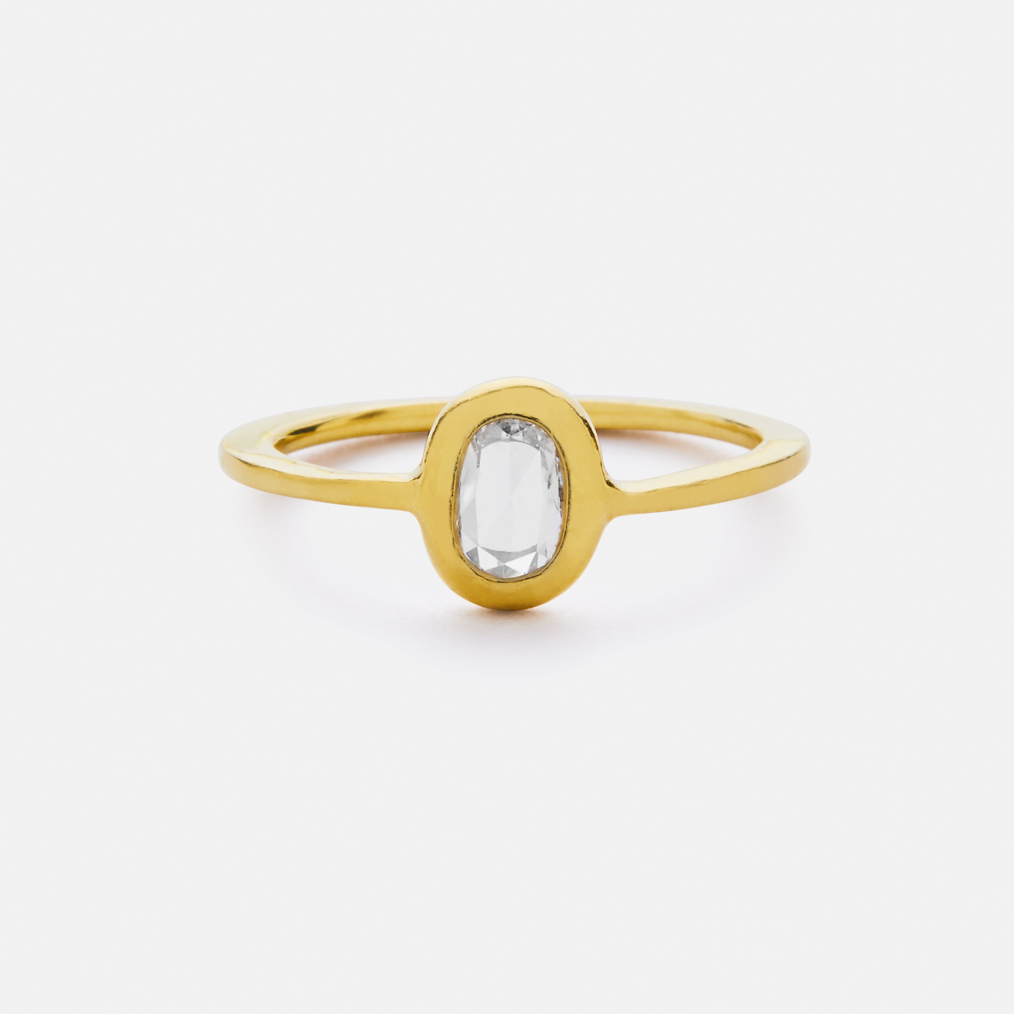 Bezel set ring featuring a 7 x 5mm white, oval-shaped, rose cut diamond (approx. wt is 0.20ct.) with band measuring 0.8mm wide x 1.8mm