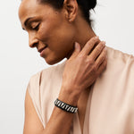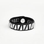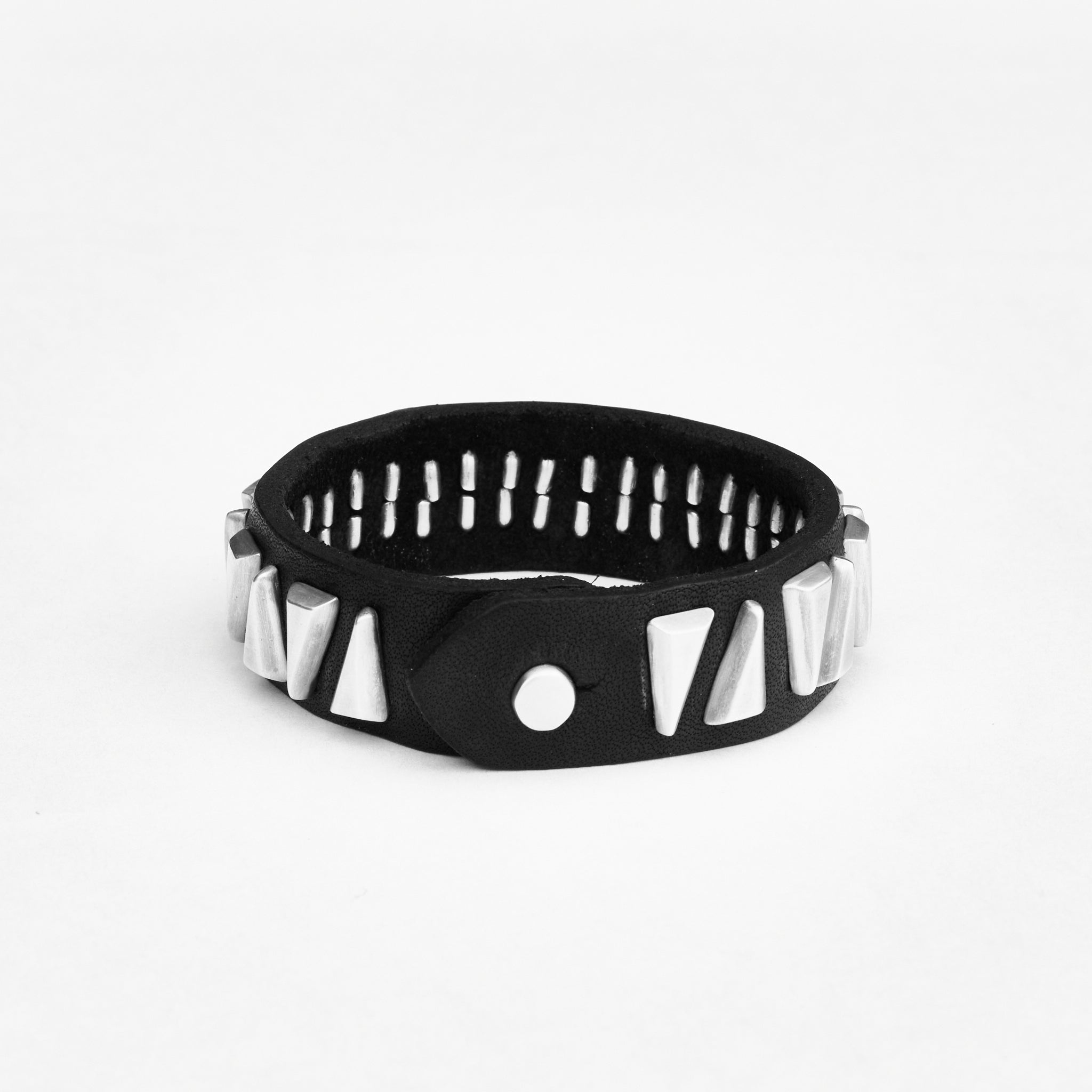 3/4" wide leather cuff with 1/2" (at their widest point) sterling silver triangles. Available in black and brown.