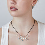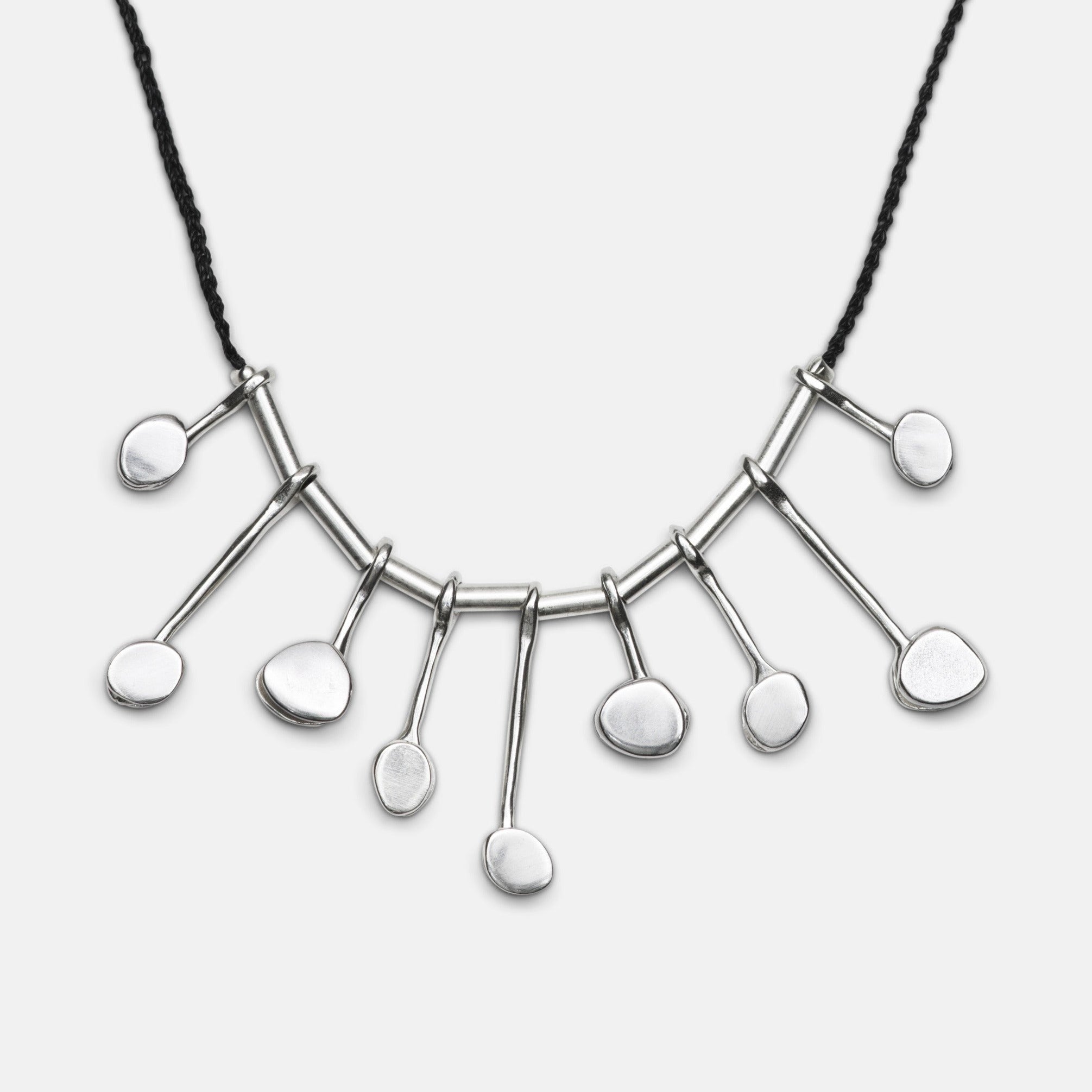 5/8" - 1" hinged pieces interspersed with 3mm sterling silver pieces on 17" hand crocheted cord with toggle clasp.