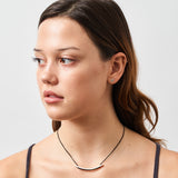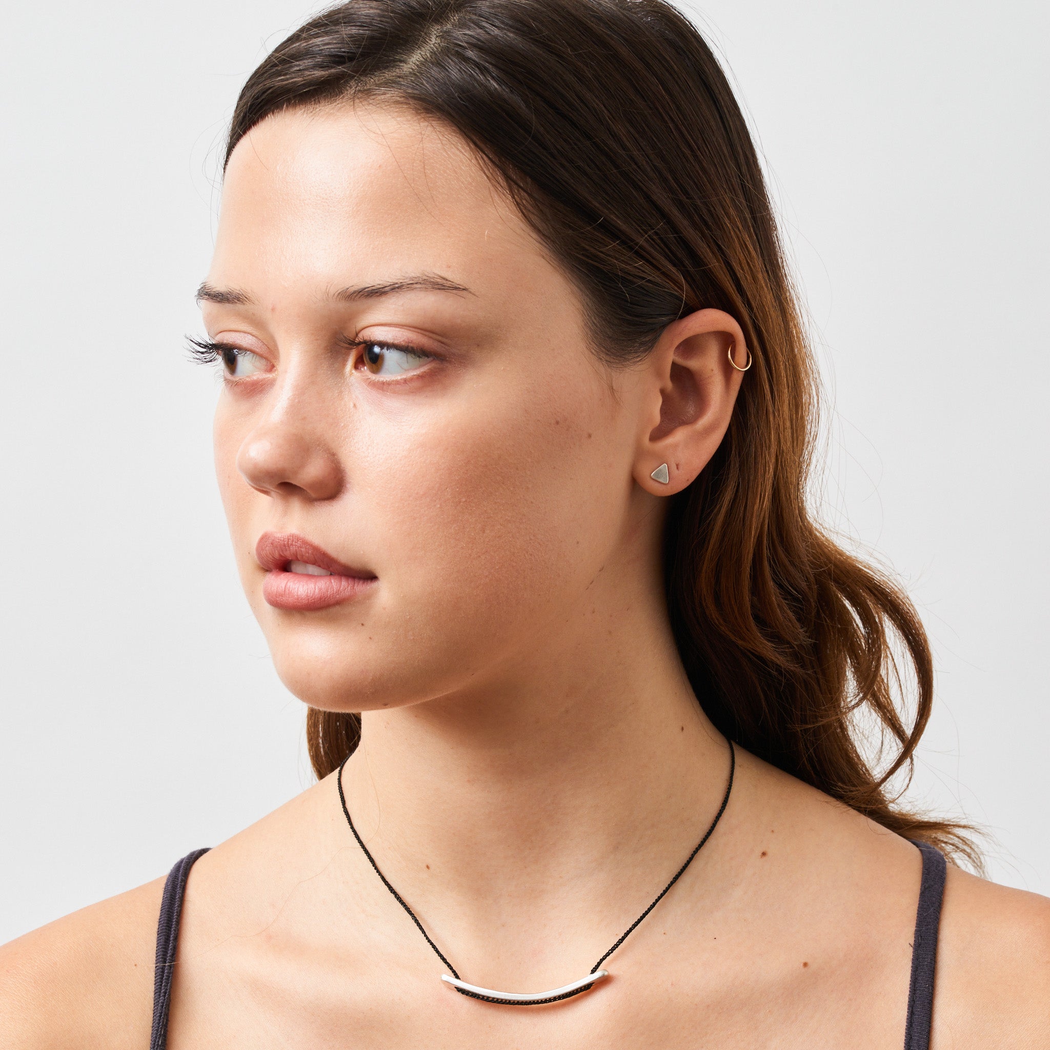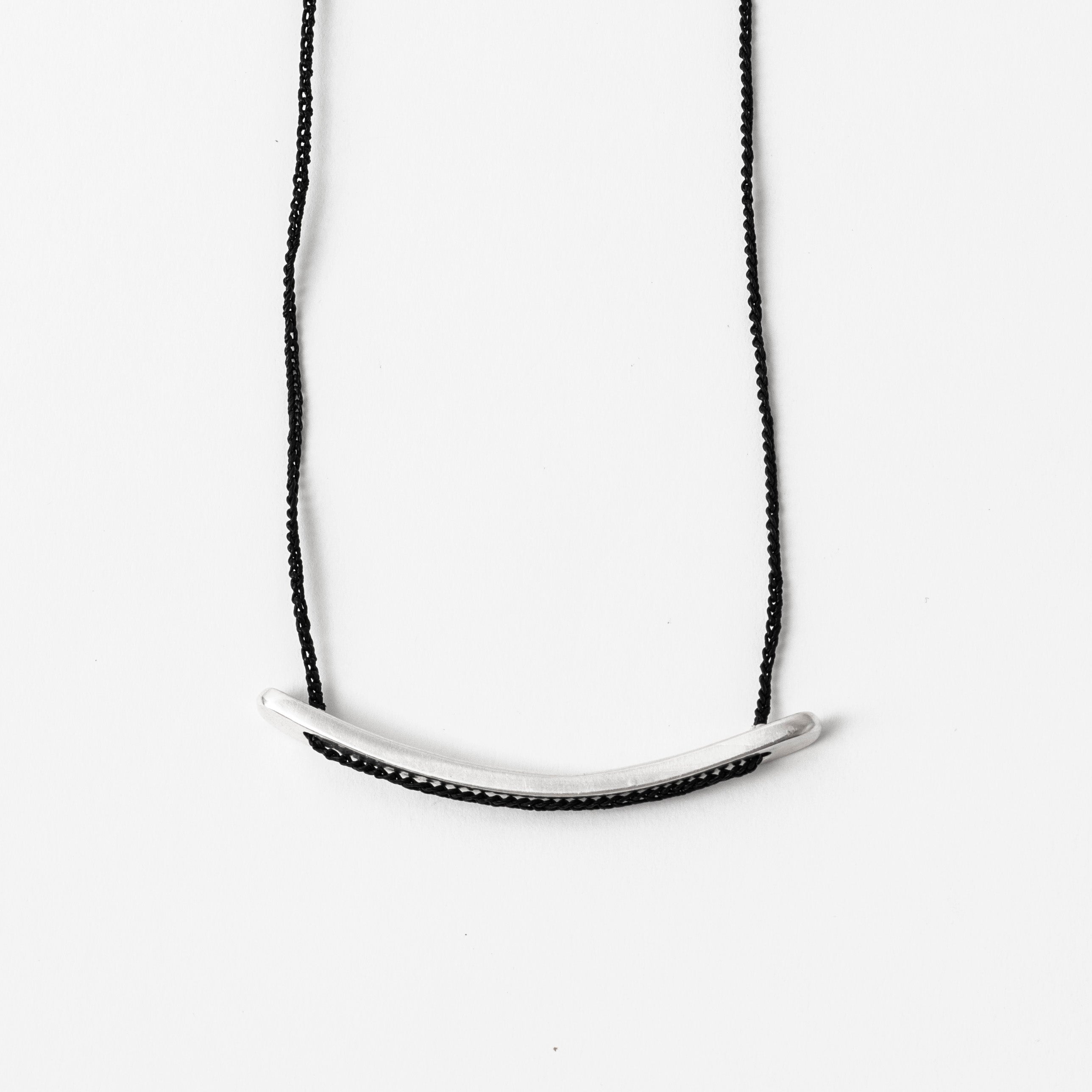 Hammered sterling silver pieces create this sculptural pendant which measures approximately 2 1/4” wide by 1/4” long. Strung on 17” crocheted cord and finished with a signature JP clasp.