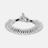 The Sprout bracelet represents growth and renewal. 1/2" moveable sterling silver pieces strung on hand crocheted cord and completed with our signature toggle clasp. Measures approximately  .5" H x .15" W