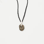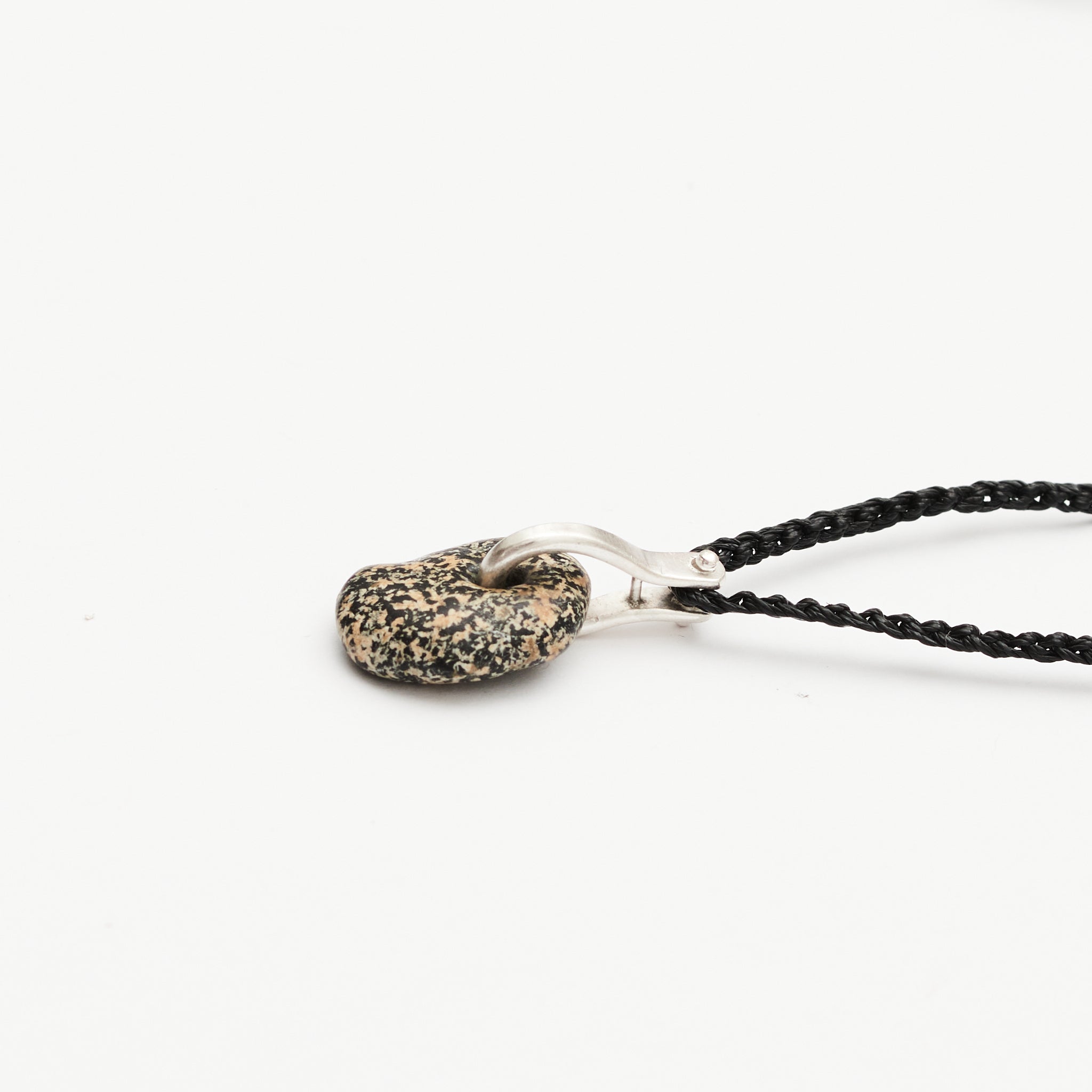 1.75" x .50" beach stone hung on sterling silver loop strung on 20" hand crocheted cord.